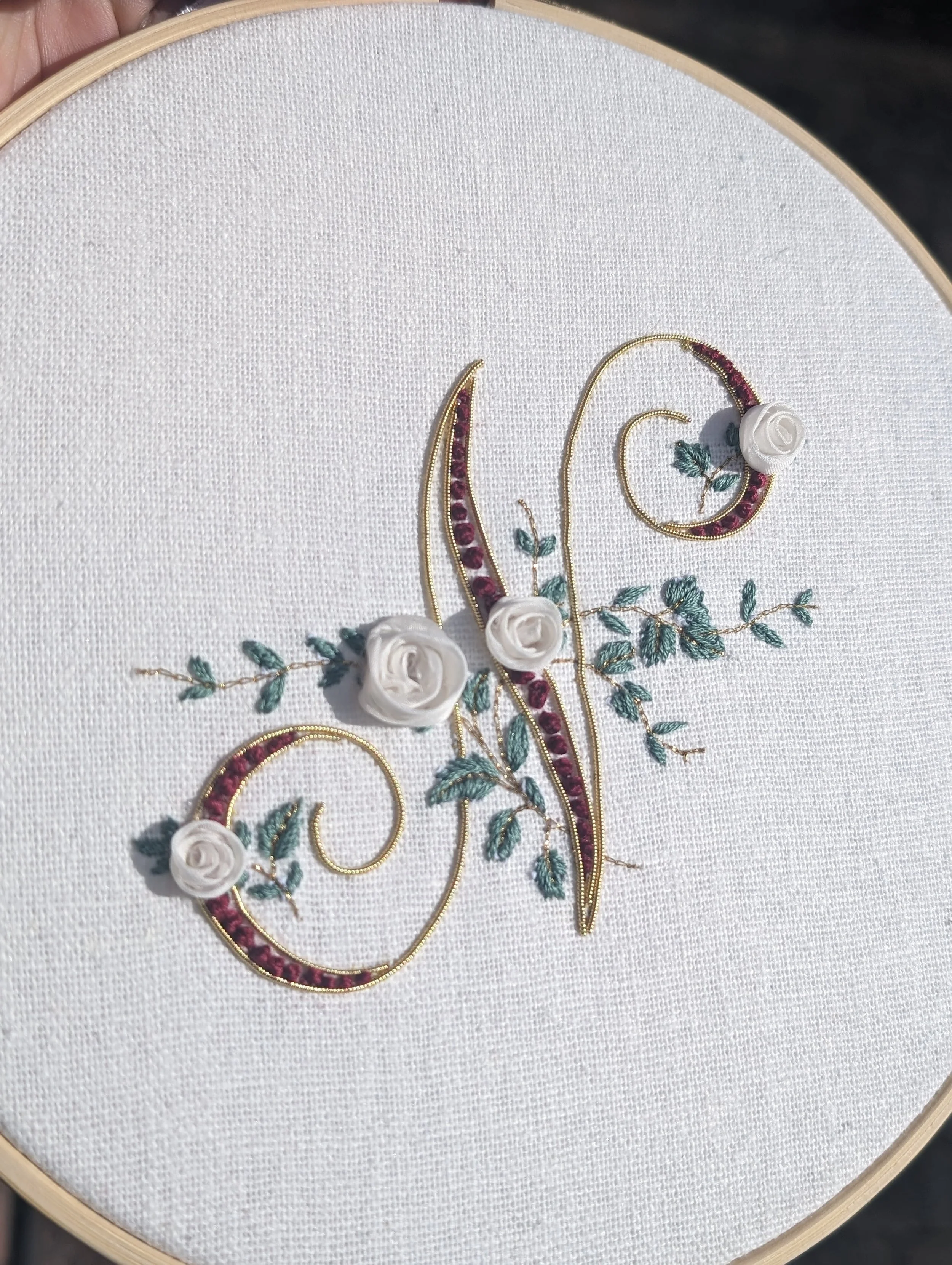 Broderie ornementale avec des roses en tissu blanc, des feuilles vertes et des détails dorés sur un fond blanc