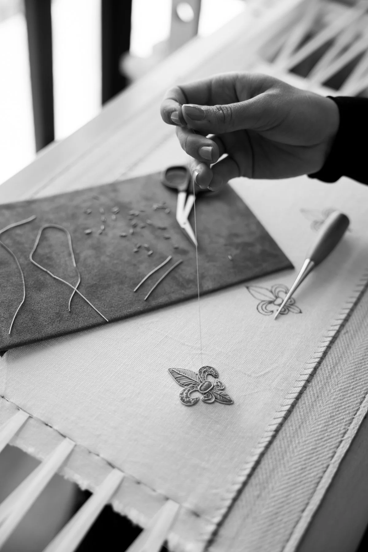 plateau avec des pendants en fil métallique, une paire de ciseaux, et une aiguille, sur un tissu blanc décoré de motifs de fleur de lys