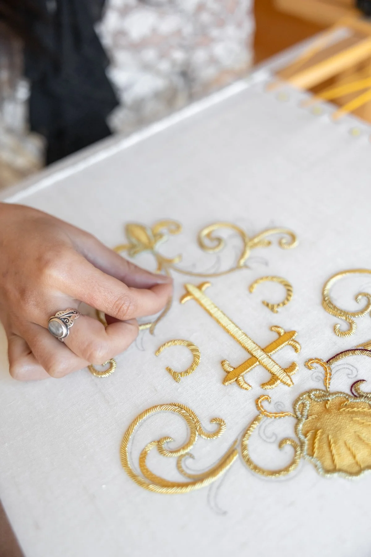 Une personne utilise un fil doré pour broder un motif complexe sur un tissu blanc, une main portant une bague est visible.